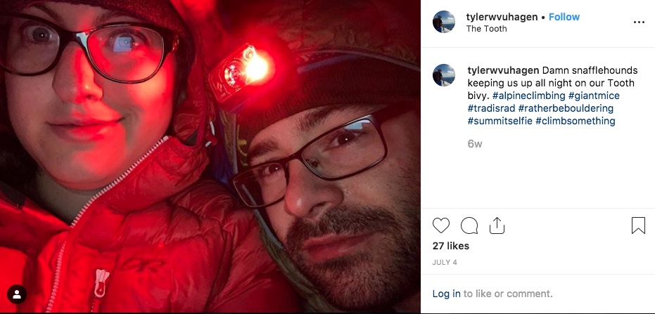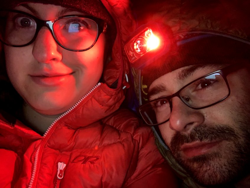 It’s 2:45 am. We’re exhausted and annoyed. As we try to decide if we should rappel down now, we whipped our headlamps around trying to make sure the snaffelhounds wouldn’t come back. Since we have cell phone service we were able to figure out civil twilight is at 4:40 am. Our plan is to brew some coffee, sit in our sleeping bags on the actual summit, and chat. We begin listening to a podcast, are able to find the Big Dipper and Cassiopeia, and I begin to write this piece. Ty points out that we haven’t seen a rodent in awhile so maybe it’s safe to go back to sleep. As if on cue, we see one run across the rock beside me. Nope, not safe to sleep. A liter of coffee and an Instagram post later, it’s civil twilight. We make breakfast (apple crisp mountain house) and begin to pack up. By 5:50 am we are rappelling into the foggy morning.