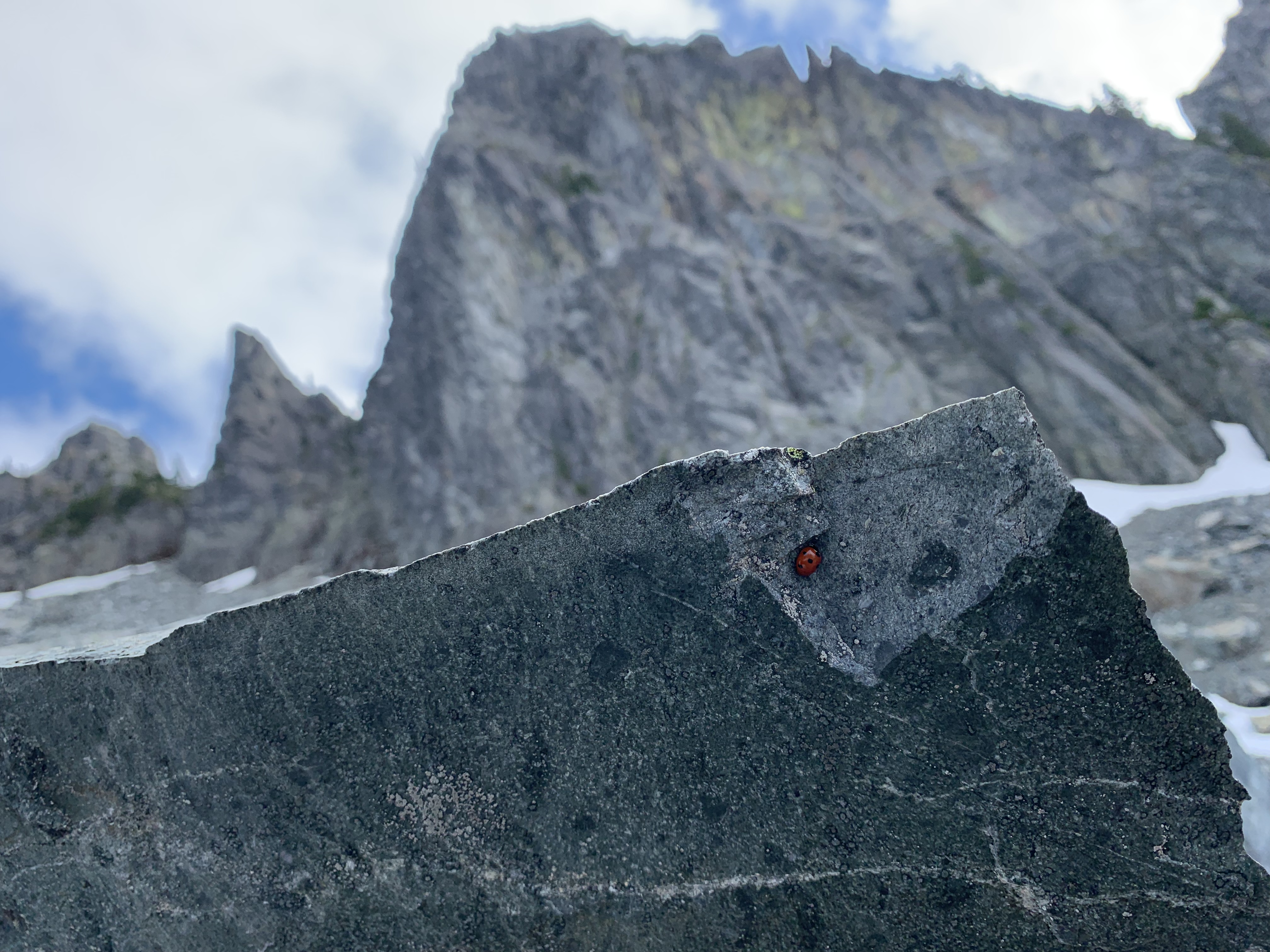 I am not the best trail finder. The clouds were covering the peaks so I had to try to find the trail without those landmarks. As I stared at the paths, trying to figure out which one to choose, I uncertainly pick the correct one. Tyler pointed out the way I chose when boot prints in the snow. I had seen them, however had figured it was a different path. I was reminded by Tyler that the simplest option is normally the correct one when in the alpine. Noted. We got to the end of the talus field around 4:40. I thought that meant we were on schedule. Ty said we were behind schedule because it’s the alpine so you’re always behind.